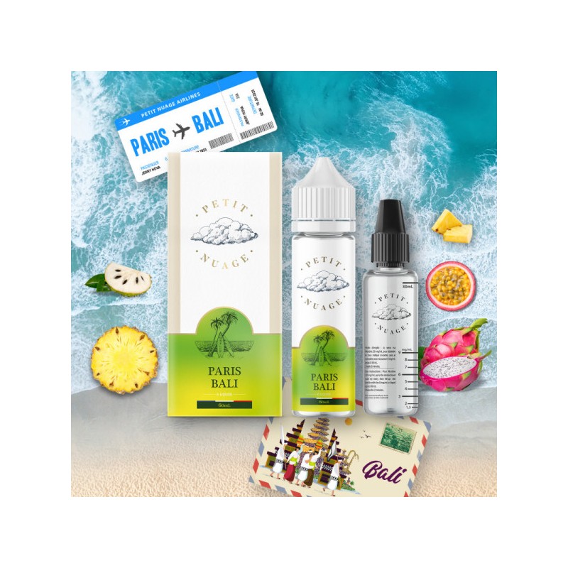 Évadez-vous vers les tropiques avec l'e-liquide "Paris Bali" 50ml de Petit Nuage. Commandez dès maintenant pour une expérience de vapotage exotique et rafraîchissante.