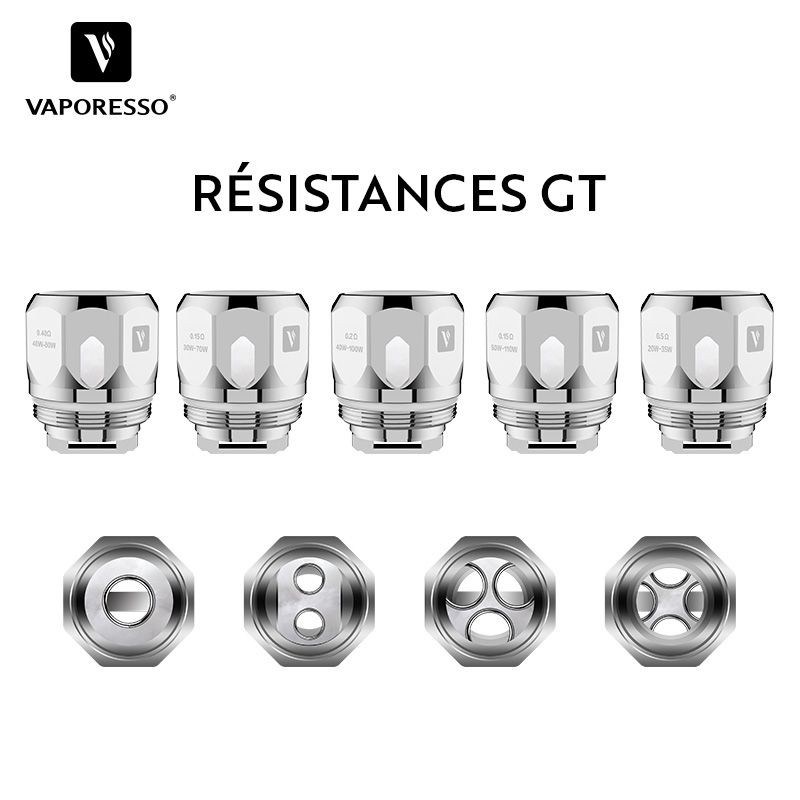 Les résistances GT de Vaporesso sont destinées au clearomiseur GT TANK de Vaporesso mais sont aussi compatibles avec les clearomiseurs TFV8 Baby et Big Baby de Smoktech (Smok).